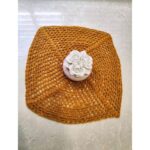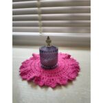 The round crochet mat in lime green features a delicate floral design with a central motif surrounded by small flowers or bobbles. Its edge is finished with a scalloped border for elegance