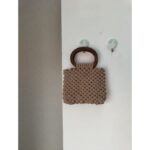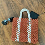 This handmade macrame bag features a vibrant yellow and white color scheme, square knot technique, geometric pattern, playful fringe, long macrame strap, comfortable crossbody wear, and closure options like magnetic snap or drawstring